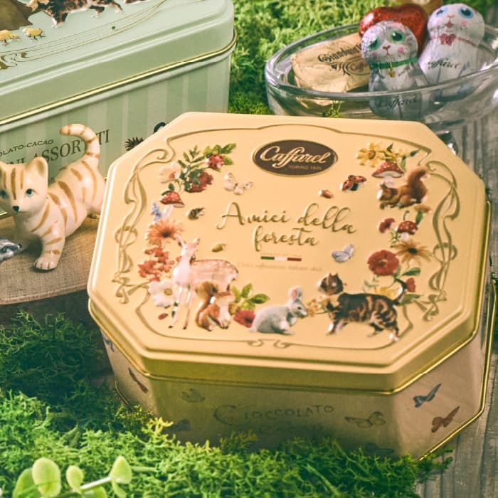 クラシックなテイストの可愛らしいデザインが人気のコレクター缶に、森に迷い込んだネコが動物達に出会うシーンが描かれています。
