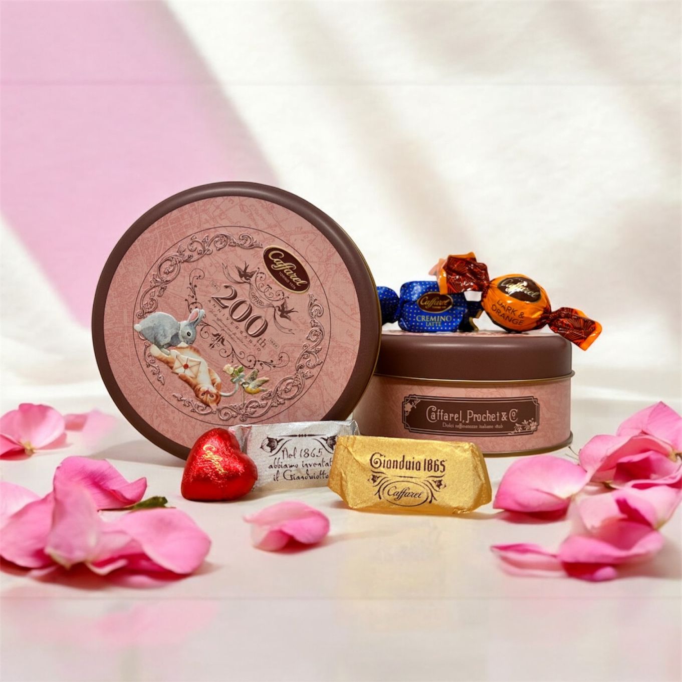 歴史感じるトリノの地図を背景に、落ち着いたピンクとチョコレートカラーが目を惹くカファレルセット缶。